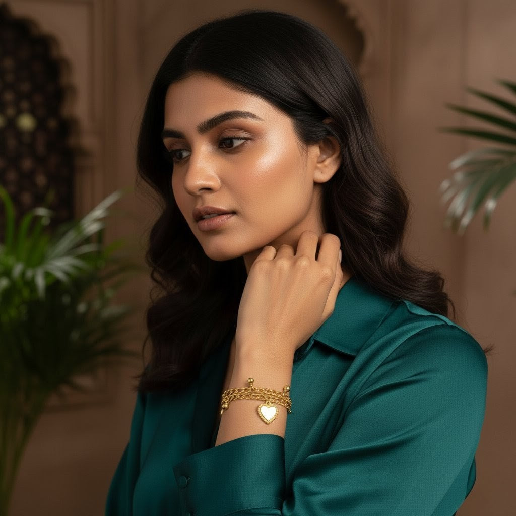 Luminous and layered, this Love Link Bracelet is a testament to heartfelt elegance. Featuring a graceful blend of two distinct golden chains—a delicate paperclip link and a finer chain with charming gold beads—it creates a beautiful, intertwined design. At its center, a polished heart charm dangles effortlessly, reflecting light with every movement and serving as a radiant symbol of affection.